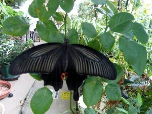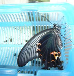 午前中、水遣りをしているときに、虫かごを見ると、羽化したクロアゲハがばたばたしています。