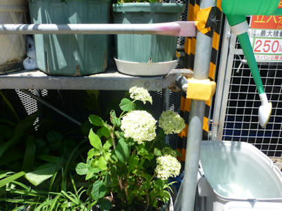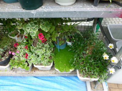 右の写真の下の植物置き場のゼラニウム類は、しっかりと花が咲いています。