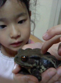 前略 ブログでお孫さんがカエルに触っている写真を見ました。