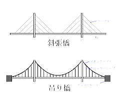 斜張橋のケーブルの張り方にも、放射型・ファン型・ハープ型があり、
